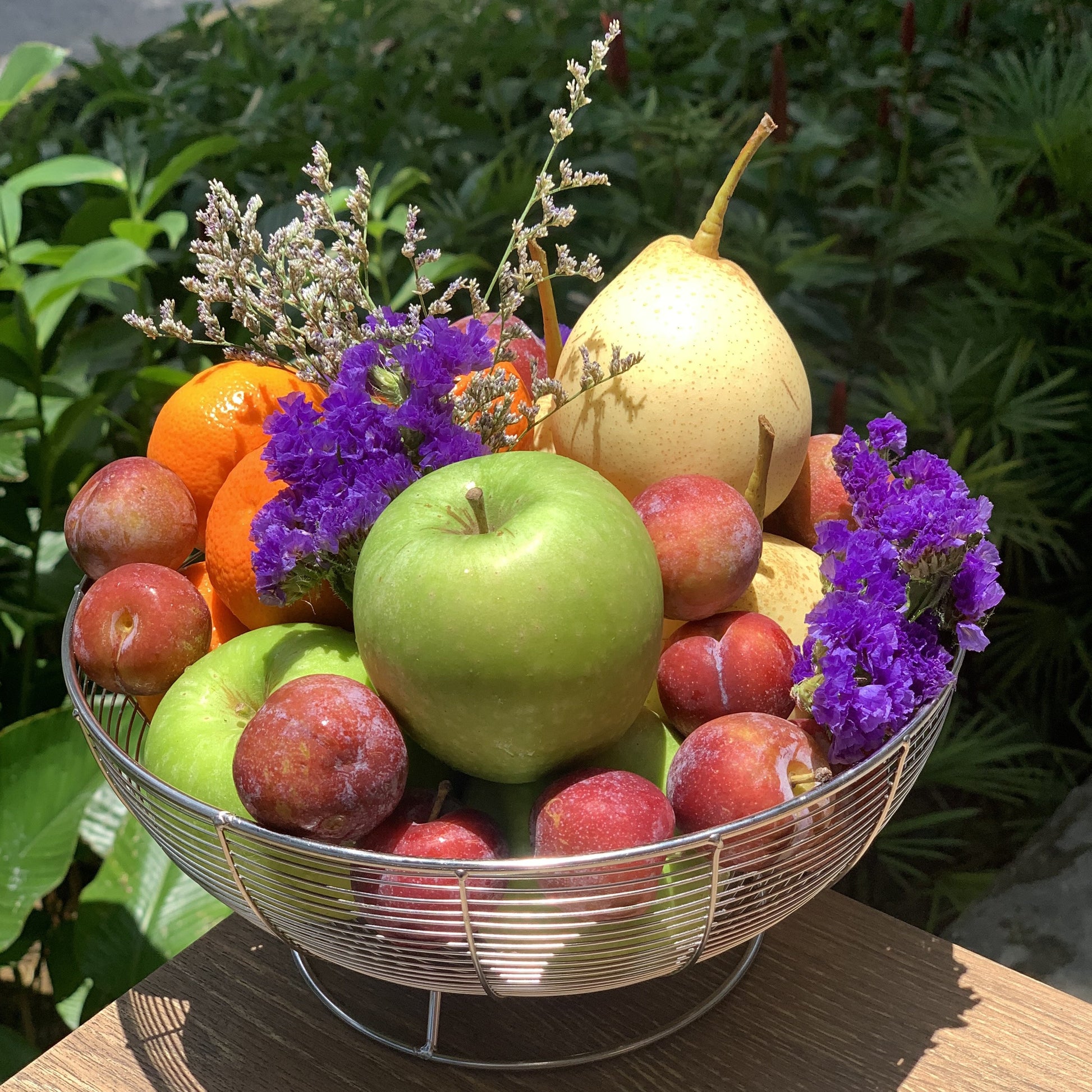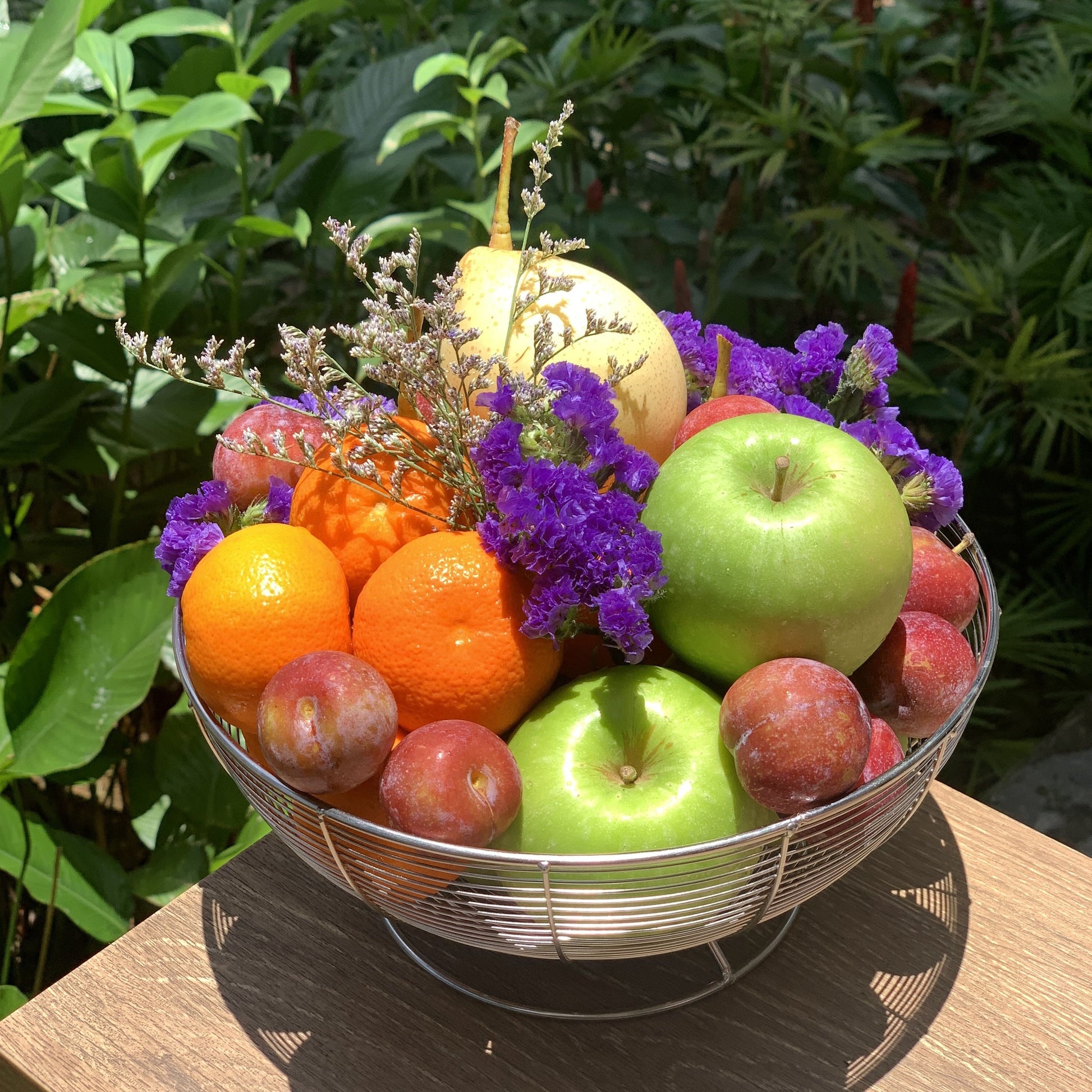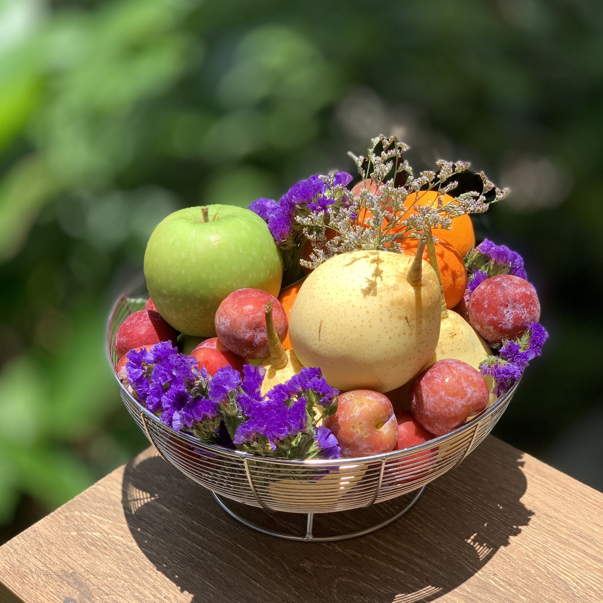 Our fruit basket is filled with artistically arranged fruits and tropical flora. Designed as an indulgent fruit bowl to grace your dining table. or for a small group to share. Our fruit basket is the ideal gift for anyone you want to wish them well or perhaps just as a way to pamper yourself.