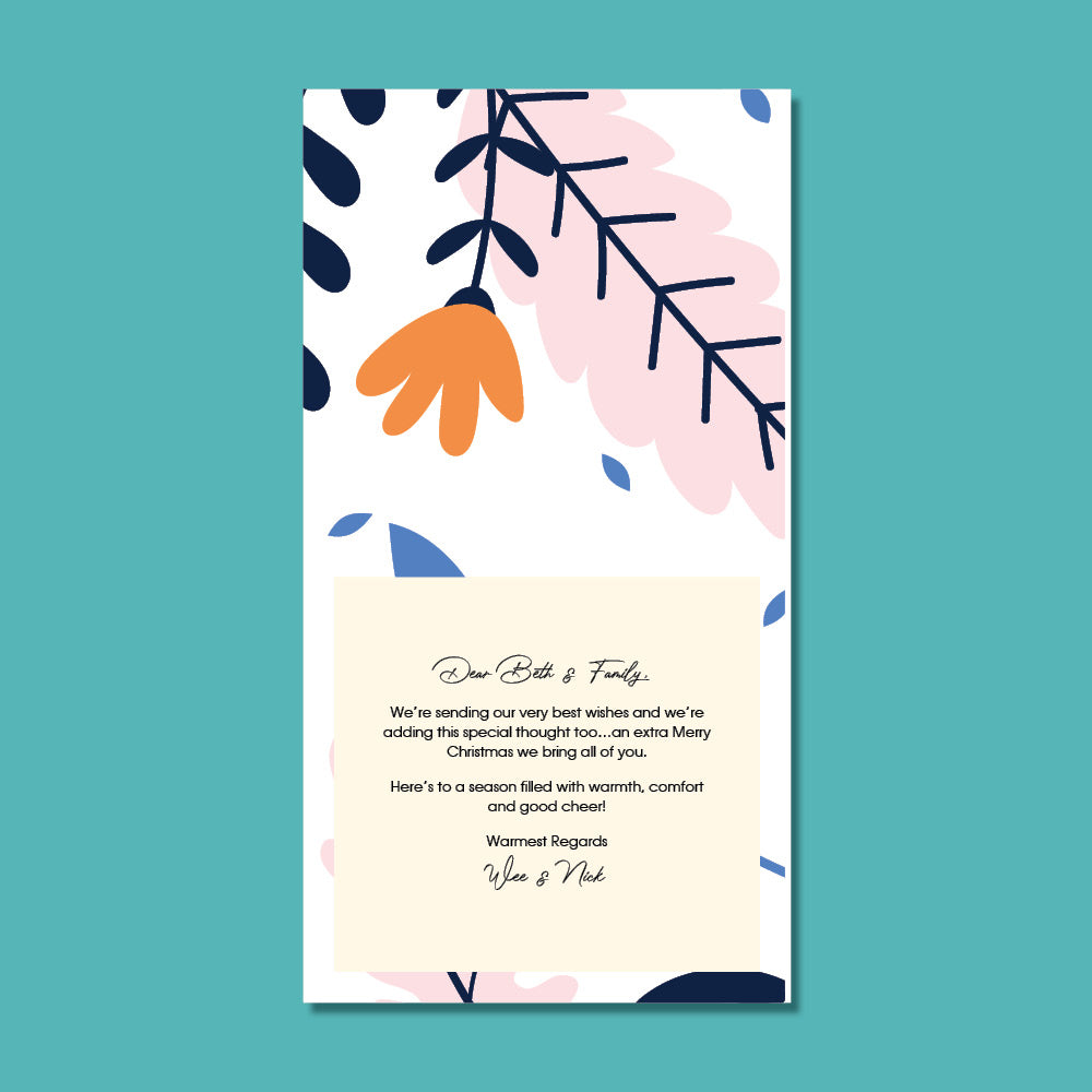 Your personalized message will be individually added to the card by our in-house graphic designers, You may add a message of up to 2 paragraphs and a maximum of 8 recipients per card. The Atlas body and name typeface has been specifically chosen for clarity and class.