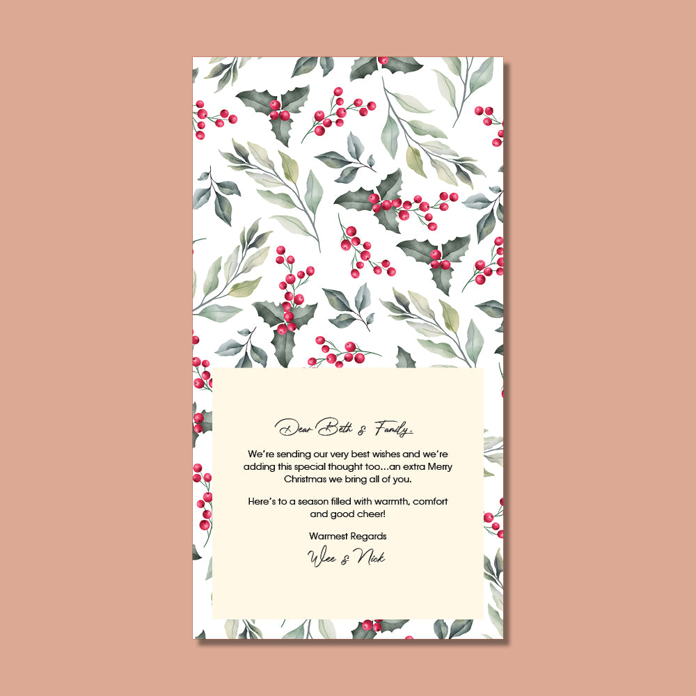 Your personalized message will be individually added to the card by our in-house graphic designers, You may add a message of up to 2 paragraphs and a maximum of 8 recipients per card. The Atlas body and name typeface has been specifically chosen for clarity and class.