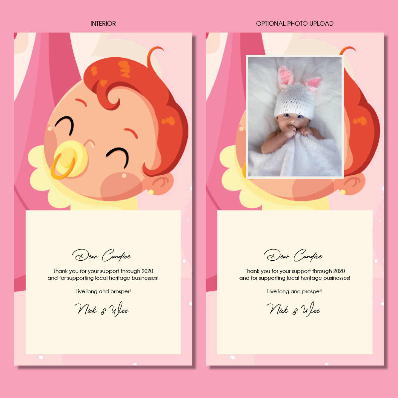 Revive the age-old tradition of greeting cards and let us assist you to send a bespoke card to your loved ones to show them you think about them with your customized messages! Your message will be added on by a professional graphic designer.