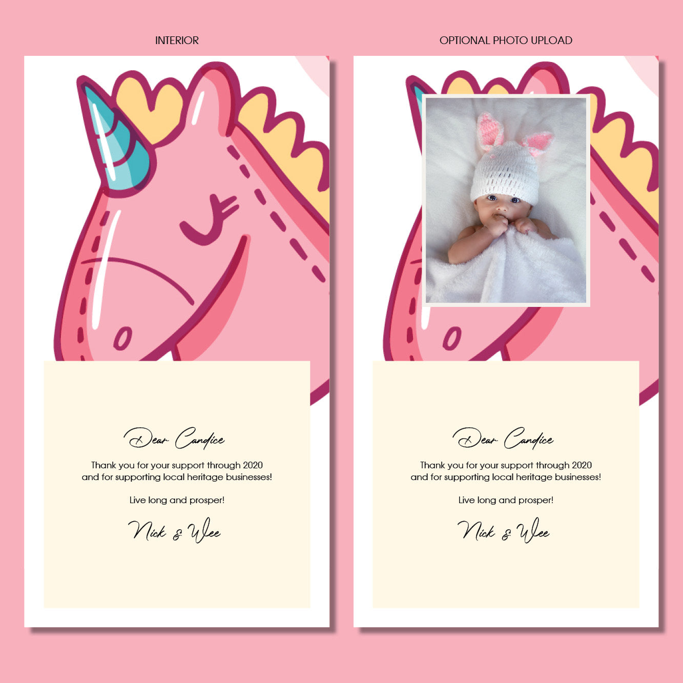 Your personalized message will be individually added to the card by our in-house graphic designers, You may add a message of up to 2 paragraphs and a maximum of 8 recipients per card. The Atlas body and name typeface has been specifically chosen for clarity and class.