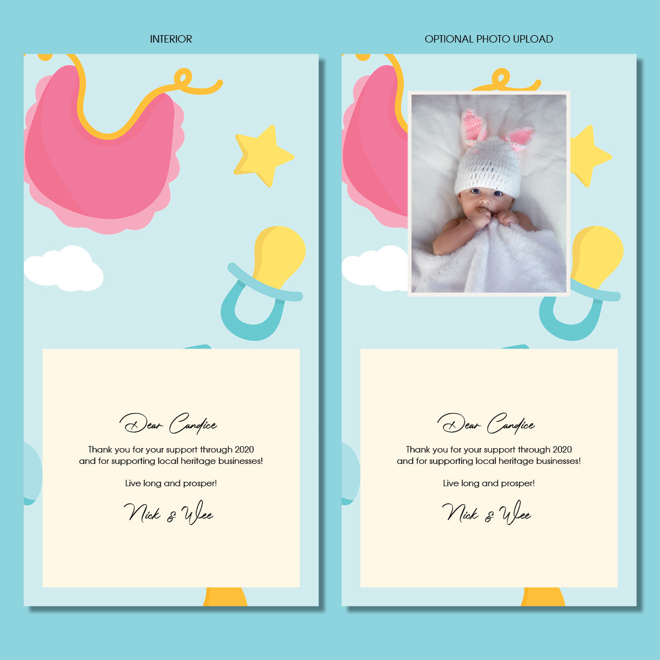 Revive the age-old tradition of greeting cards and let us assist you to send a bespoke card to your loved ones to show them you think about them with your customized messages! Your message will be added on by a professional graphic designer.