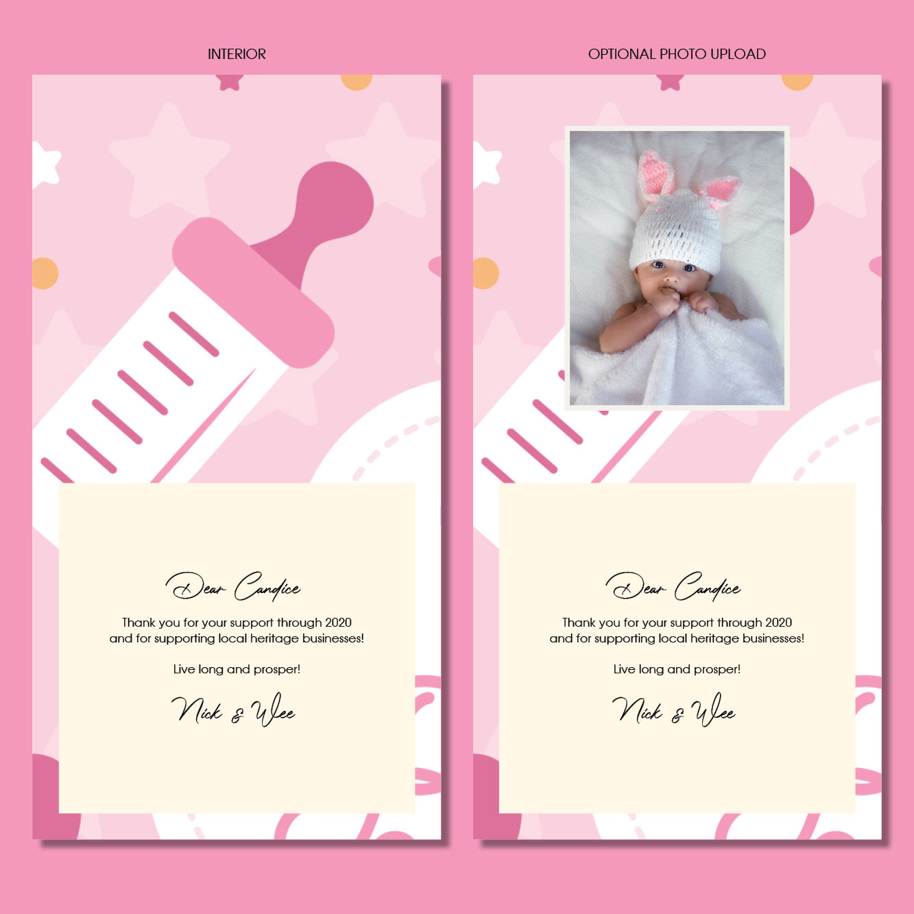 Revive the age-old tradition of greeting cards and let us assist you to send a bespoke card to your loved ones to show them you think about them with your customized messages! Your message will be added on by a professional graphic designer.